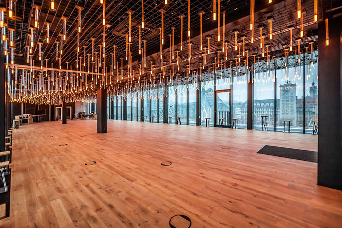 Direkt im selben Gebäude befindet sich die spektakuläre Rooftop-Location Felix im Staycity Leipzig. Hoch über den Dächern der Stadt erwartet euch eine einzigartige Atmosphäre mit modernem Design, großzügigen Eventflächen und einer beeindruckenden Aussicht über Leipzig.